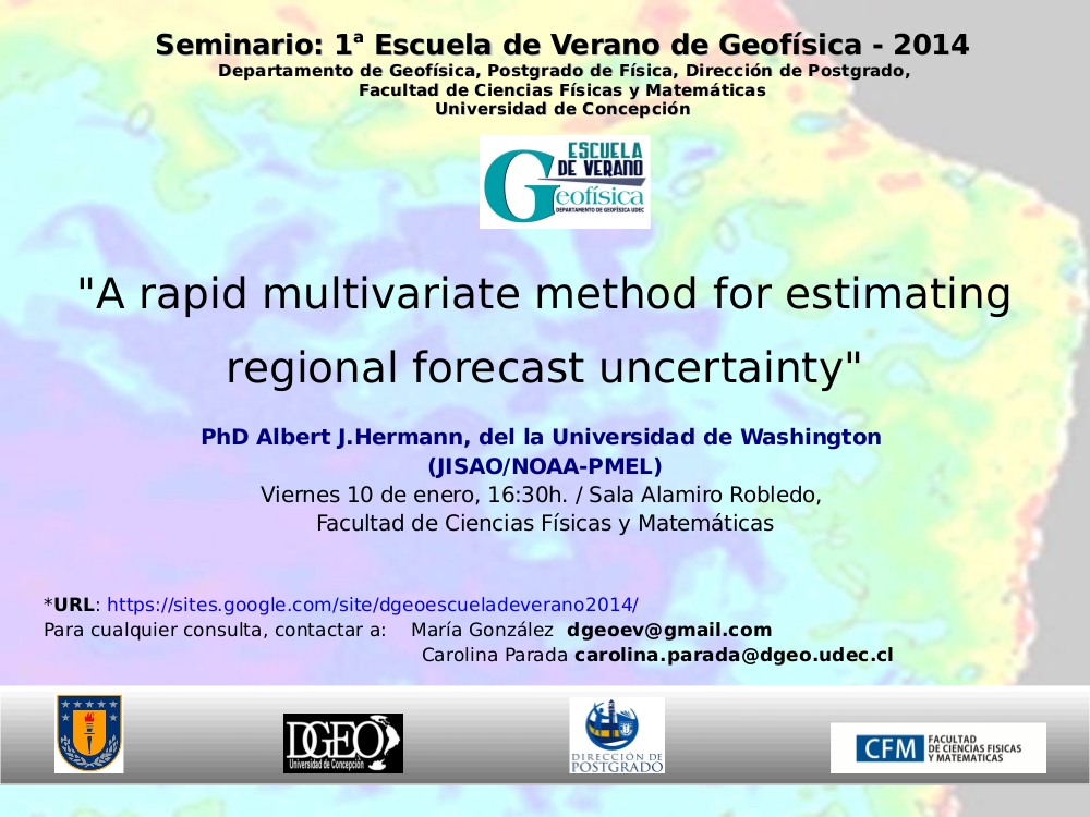 Se invita a todos los interesados a participar en el seminario « A rapid multivariate method for estimating regional forecast uncertainty «, que se realizará en el contexto de la Escuela de Verano de Geofísica, y será dictado por PhD Albert J. Hermann , Académico de la Universidad de Washington.