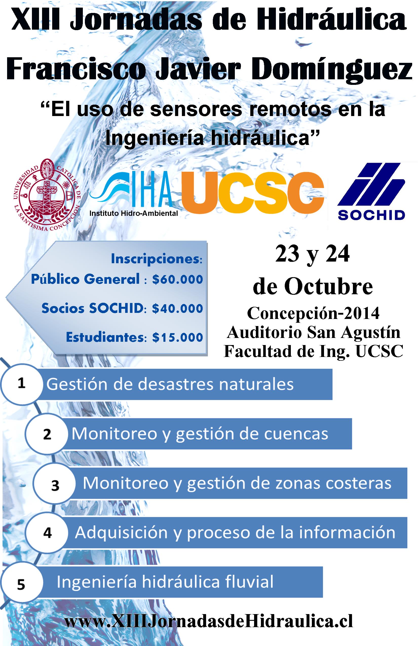 Los días 23 y 24 de Octubre próximo se desarrollarán las XIII Jornadas de Hidráulica Francisco Javier Domínguez, en el Auditorio San Agustín de la Universidad Católica de Concepción en Concepción, Concepción.