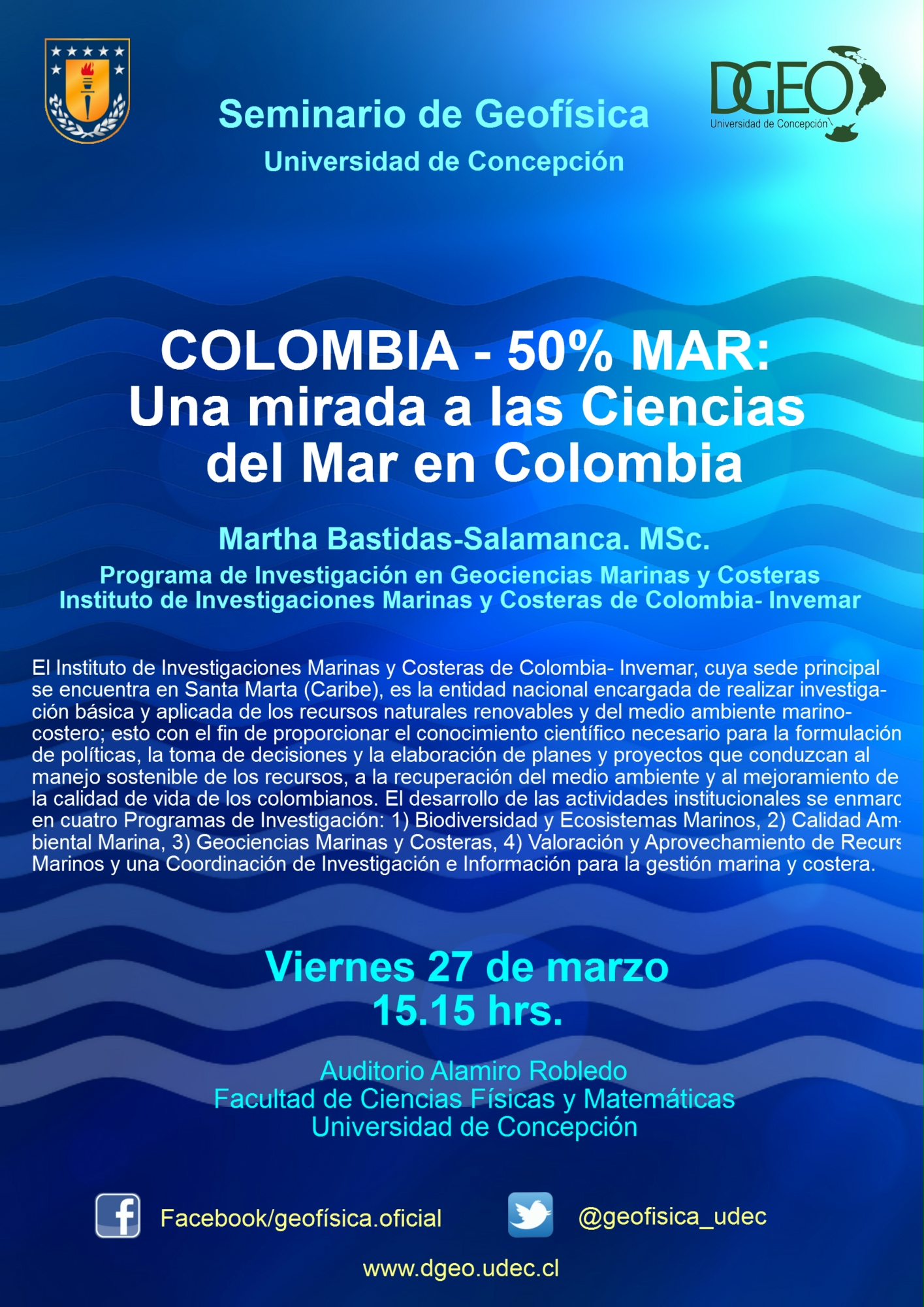 Martha Bastidas es Jefa de la línea de Oceanografía y Clima, perteneciente al Programa de Geociencias Marinas y Costeras del Instituto de Investigaciones Marinas y Costeras «José Benito Vives de Andréis»-INVEMAR, de Colombia, y por estos días realiza una estadía de carácter académico en nuestro Departamento. “Tengo altas expectativas de esta visita, porque el DGEO está muy bien posicionado a nivel internacional”, cuenta Bastidas, quien ha regresado a las aulas, para tomar cursos del área de Oceanografía Física con los profesores Aldo Montecinos, Oscar Pizarro, y con Osvaldo Artal, este último, estudiante del programa de Doctorado de Ciencias Físicas de la UDEC.