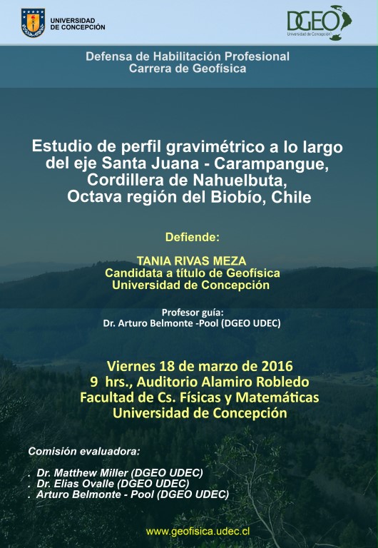 Se invita a toda la comunidad universitaria a presenciar la defensa de Habilitación Profesional de la alumna TANIA RIVAS MEZA, quien optará al título profesional de Geofísica de la Universidad de Concepción el día viernes 18 de marzo del presente año, a las 9 hrs. “Estudio de perfil gravimétrico a lo largo del eje Santa Juana – Carampangue, Cordillera de Nahuelbuta, Octava región del Biobío, Chile” es el nombre del trabajo de la alumna, el cual fue guiado por el profesor Arturo Belmonte -Pool, académico del Departamento de Geofísica.