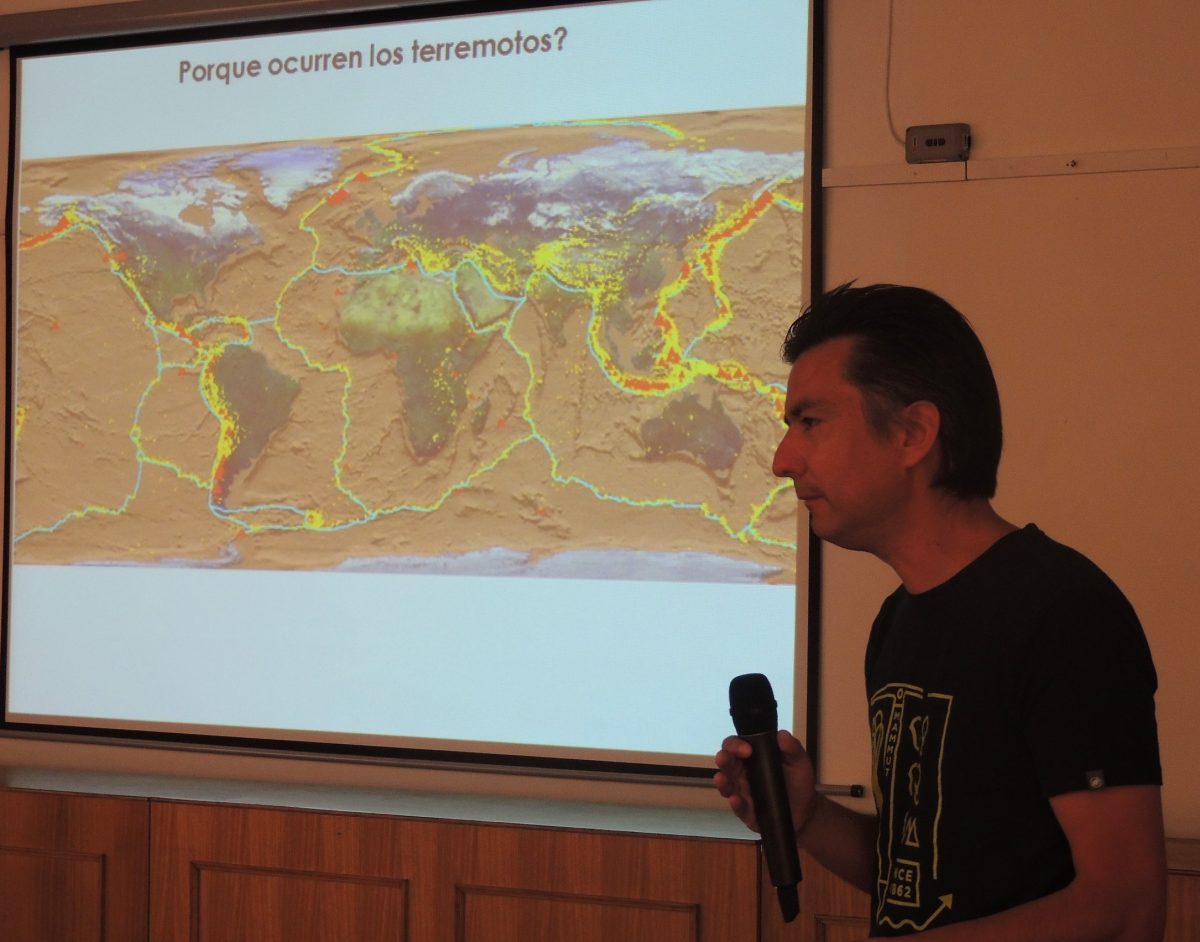 El también doctor en deformaciones relacionadas con terremotos explicó el proceso general y mundial del movimiento de placas tectónicas que genera los sismos y el volcanismo, para luego adentrarse al caso de Chile y al rol fundamental de las placas de Nazca y Sudamericana. Allí describió la segmentación de ambas y cómo los terremotos se producen en uno o más de estos segmentos en períodos que tienen cierta periodicidad o ciclos.