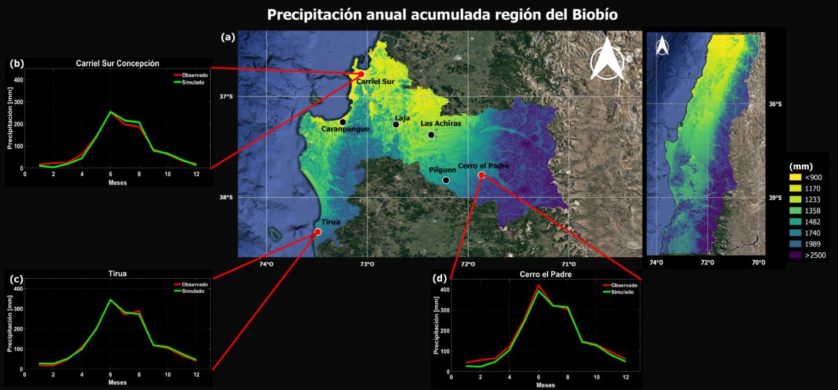 La figura (a) presenta la precipitación acumulada anual (2000-2011) de la Región del BÍo bío (izquierda) y la extensión de la base por todo Chile (derecha). Las figuras (b), (c) y (d) indican el contraste de las medias mensuales entre datos observados y simulados (2000-2011), respectivas a las estaciones de observación Carriel Sur Concepción, Tirúa y Cerro el Padre.