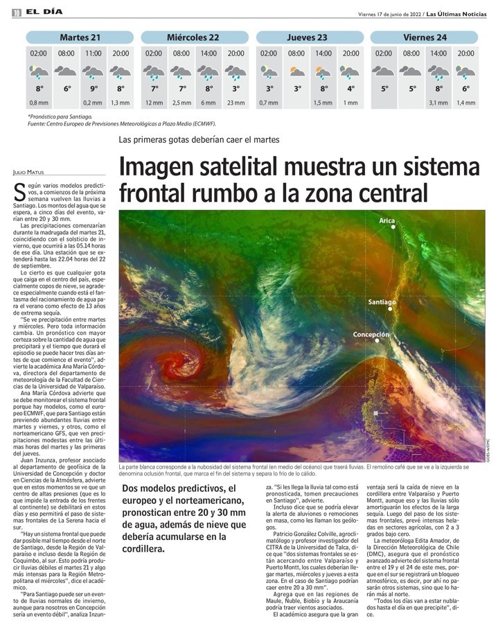 Destacados Dr. Juan Inzunza explica nuevo sistema frontal para Chile central por Alejandro Baño Oyarce|Publicada 17 junio, 2022 Entrevista en diario Las Últimas Noticias complementa nota con diversos expertos en climatología