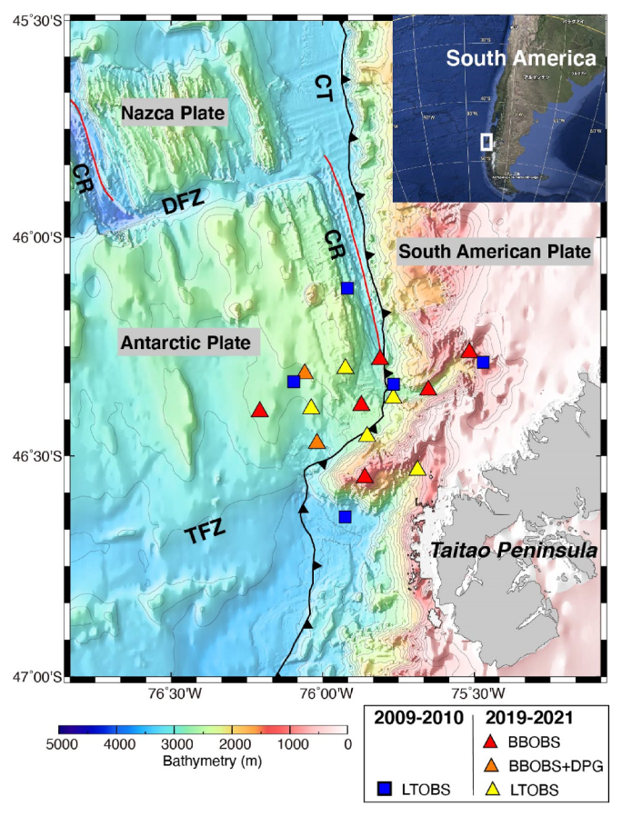 Durante tres años continuos de investigaciones, un equipo de científicos de Japón y Chile lograron instalar instrumentos de medición sísmica en el fondo marino del sur de nuestro país para registrar y conocer mejor la zona denominada Punto Triple, en el que se unen las placas tectónicas de Nazca, Antártica y Sudamericana, lo que lo hace una zona de alto interés científico. El problema: su difícil acceso, pues es zona oceánica del sur de Chile, con fuertes vientos y oleajes, lejos de urbes con servicios y apoyo logístico.