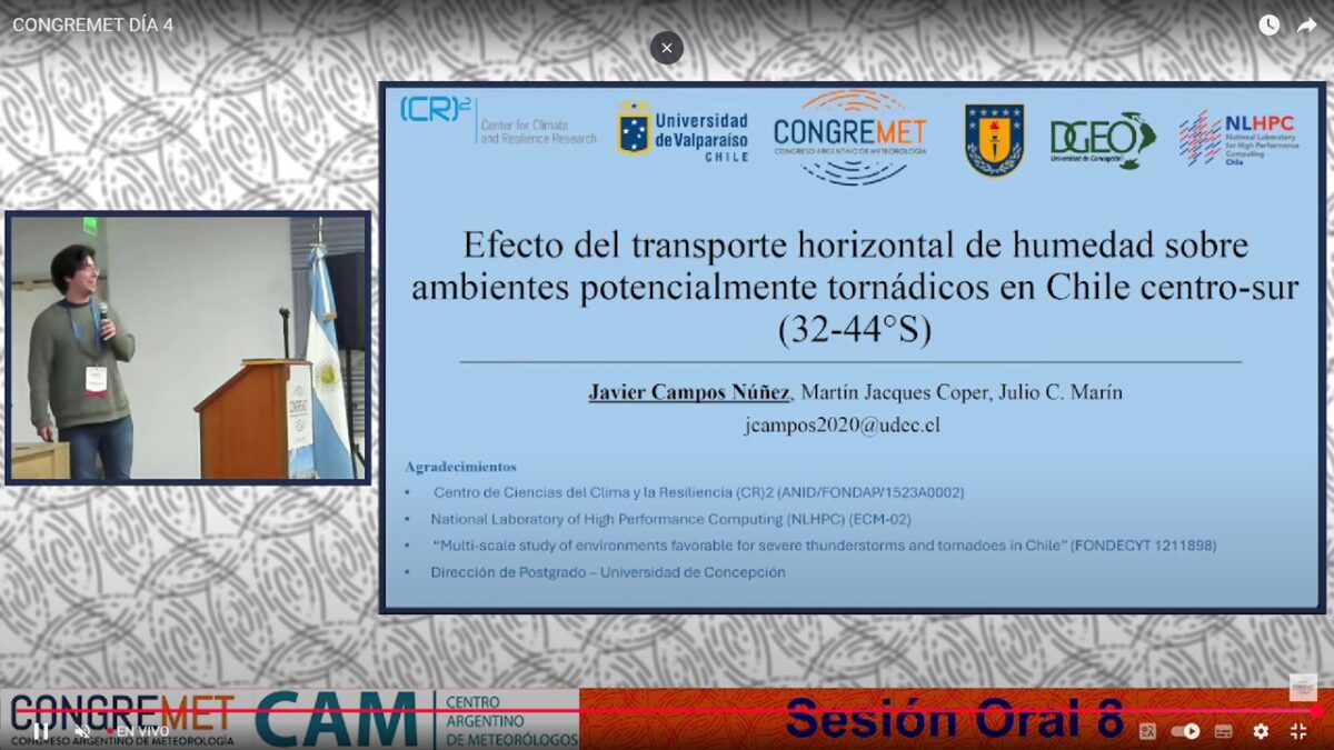 En tanto, su compañero Javier Campos presentó el viernes 3 el estudio “Efecto del transporte horizontal de humedad sobre ambientes potencialmente tornádicos en Chile centro sur”, que analiza cómo los flujos de humedad influyen en la formación de tormentas severas y tornados en el país.
