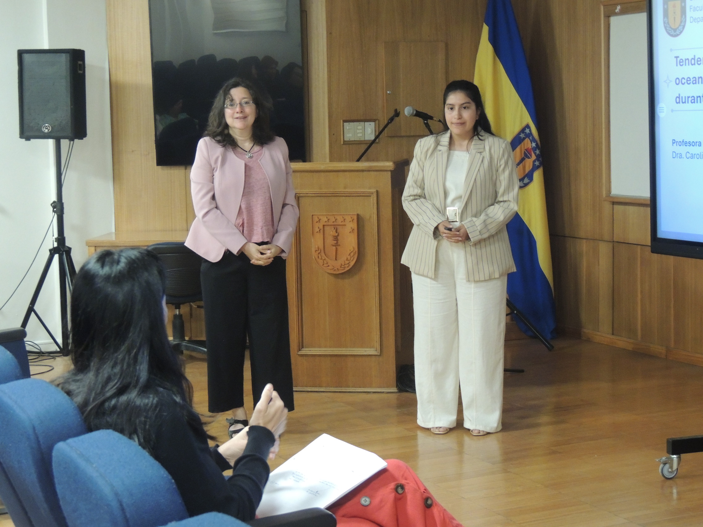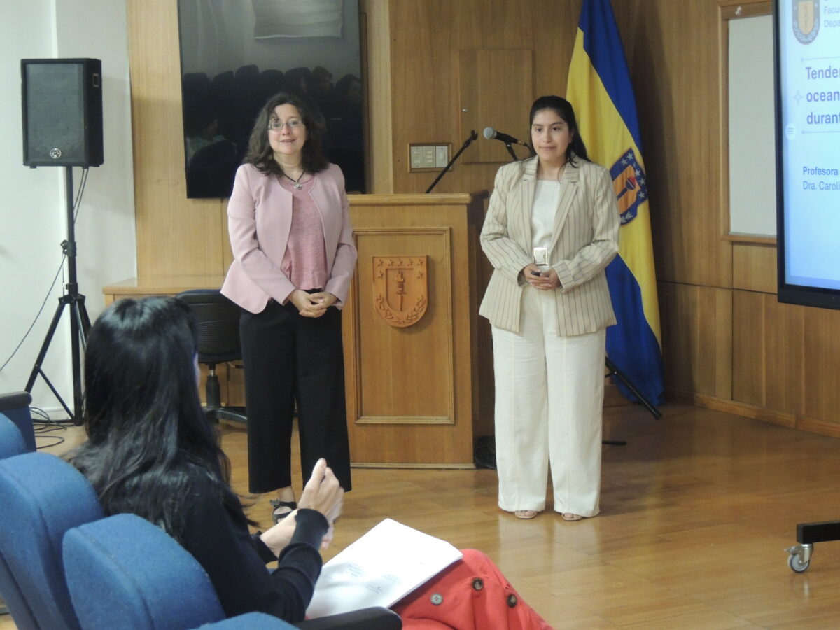 Loreto Fernández Gutiérrez expuso los resultados de su tesis sobre las tendencias de largo plazo de las condiciones oceanográficas frente a la zona centro-norte de Chile entre 1973 y 2023, donde identificó cambios estructurales en variables como temperatura, salinidad y oxígeno disuelto.