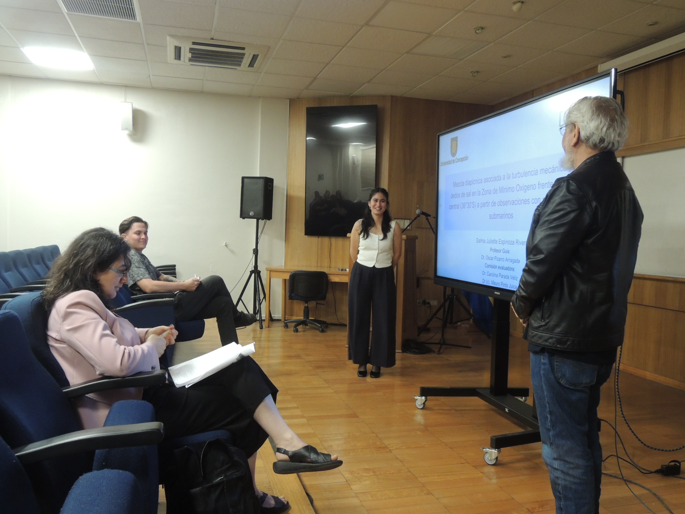 Su comisión estuvo integrada por su profesora guía, Dra. Carolina Parada, académica de Geofísica UdeC; el Dr. Marcel Ramos, del Departamento de Biología Marina de la U. Católica del Norte; y la Dra. Ilaria Tabone, académica de Geofísica UdeC.