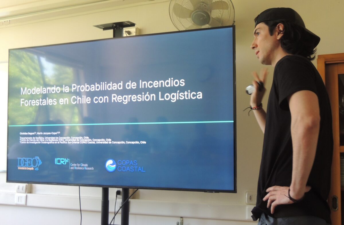 Durante la mañana, las presentaciones abordaron principalmente la relación entre incendios, clima y circulación atmosférica. Catalina Mendiburo expuso sobre los incendios forestales estivales entre Maule y Bío Bío, analizando la relación entre el área quemada estacional y la ocurrencia de condiciones meteorológicas intensas. Posteriormente, Natalia Ruiz presentó un análisis de las configuraciones sinópticas asociadas a grandes incendios forestales en subregiones del centro-sur de Chile, mientras que Matías Pérez examinó la vinculación entre eventos cálidos extremos transientes de verano y la propagación de incendios forestales en el período 1984–2023.