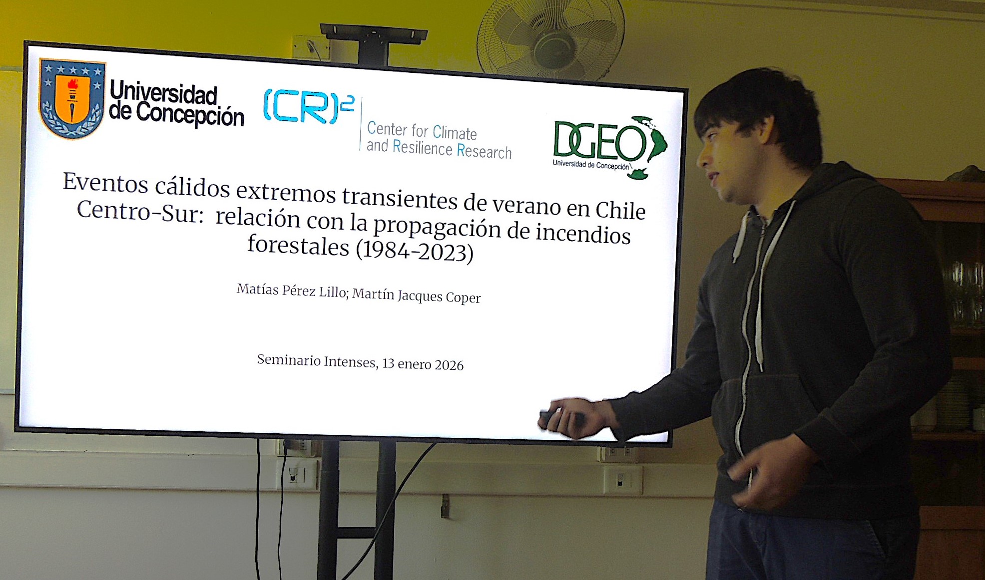 El seminario contó con la participación de charlistas principales, entre ellos el Dr. Martín Jacques, de Geofísica UdeC, investigador del Centro de Ciencia del Clima y la Resiliencia (CR2) e investigador principal del proyecto INTENSE, quien abrió la jornada con una introducción centrada en los avances recientes en la meteorología de los incendios forestales en Chile, destacando el creciente rol de las condiciones atmosféricas extremas en los eventos de gran magnitud, como olas de calor.