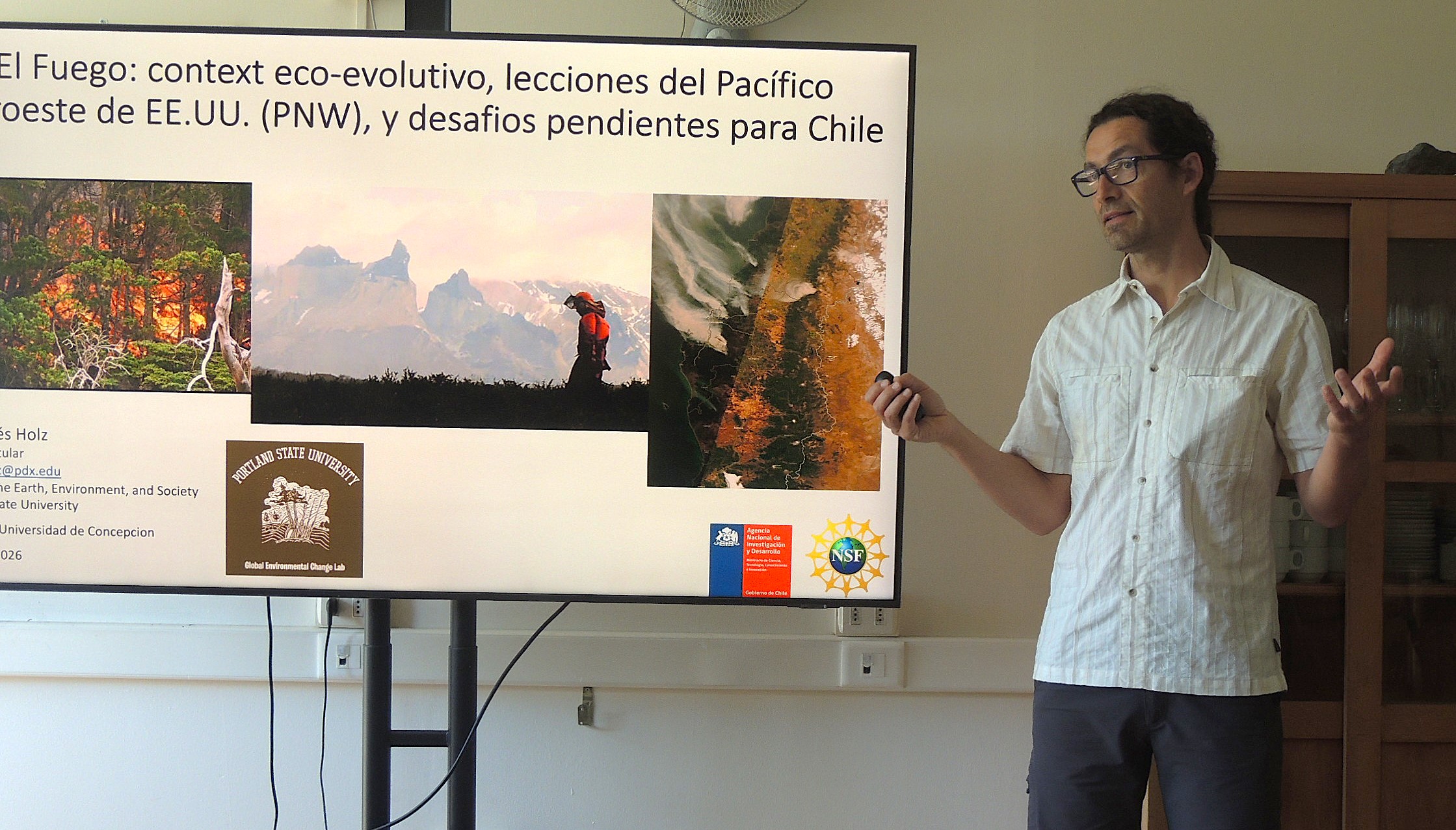 En el bloque final del seminario, el Dr. Francisco de la Barrera, de la Facultad de Ciencias Ambientales de la UdeC, abordó los efectos de los megaincendios en Chile, como los relacionados con la salud humana; y sus implicancias para la planificación y la gestión ambiental, subrayando la necesidad de fortalecer la resiliencia territorial frente a estos eventos. La jornada culminó con la charla del Dr. Andrés Holz, investigador del Global Environmental Change Lab de Portland State University (EE.UU.), quien presentó una mirada eco-evolutiva del fuego como disturbio ecológico, integrando lecciones del Pacífico Noroeste de Estados Unidos y reflexionando sobre los desafíos pendientes para Chile en prevención, manejo del combustible y restauración ecológica.