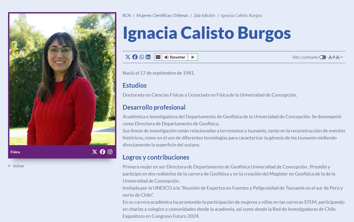 La académica Ignacia Calisto Burgos, de Geofísica Universidad de Concepción, fue una de las investigadoras destacadas en la Segunda Edición de la Tabla Periódica de las Mujeres Científicas Chilenas, que organiza la Biblioteca del Congreso Nacional, una iniciativa digital e interactiva que destaca el aporte histórico y contemporáneo de investigadoras en distintas áreas del conocimiento.