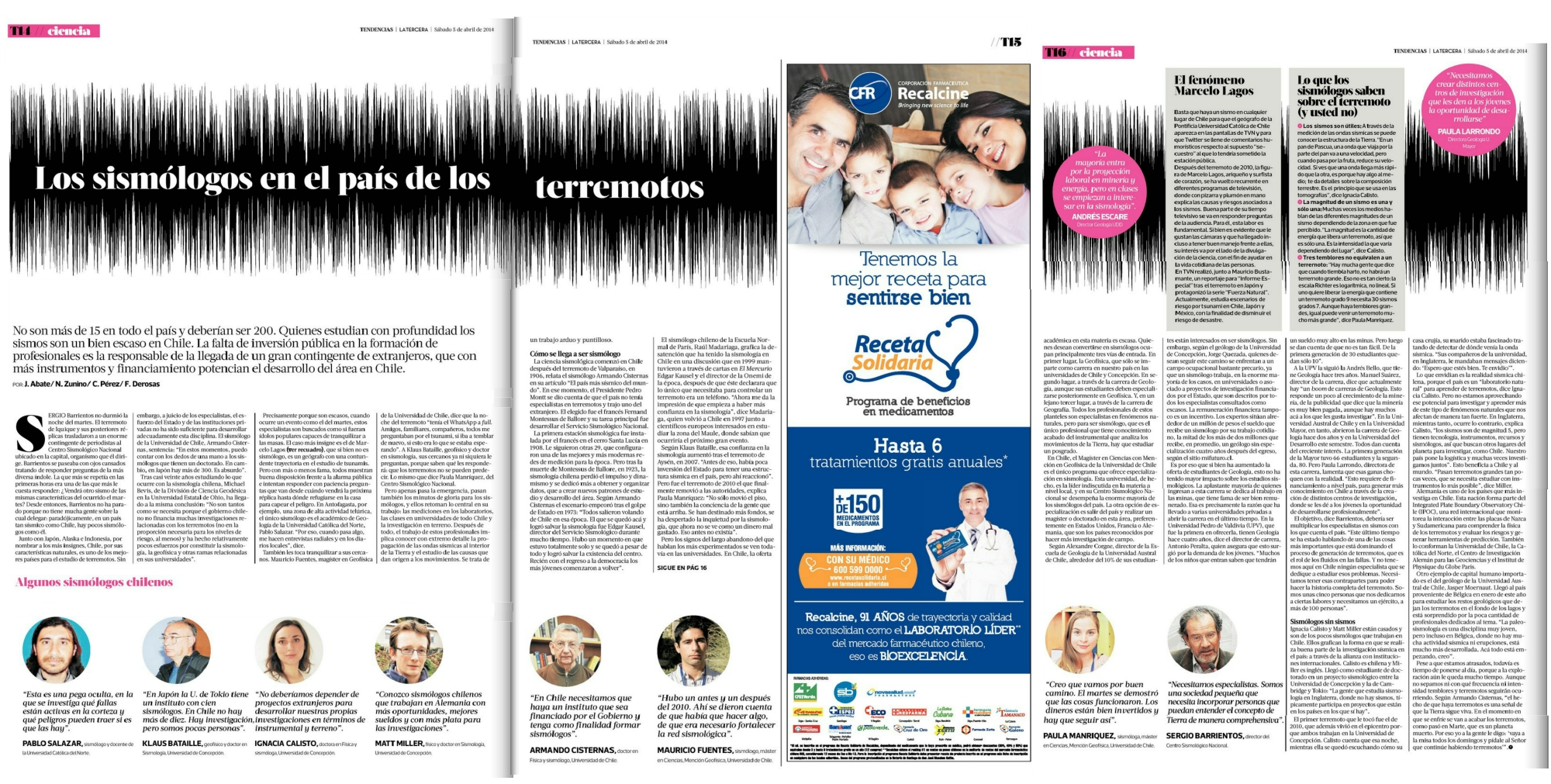 Los invitamos a revisar el reportaje “Los Sismólogos en el país de los Terremotos” (La Tercera, Tendencias), publicado el recién pasado sábado 5 de abril del presente, y donde participan los profesores Ignacia Calisto, Matt Miller y Klaus Bataille (Cs. De la Tierra).