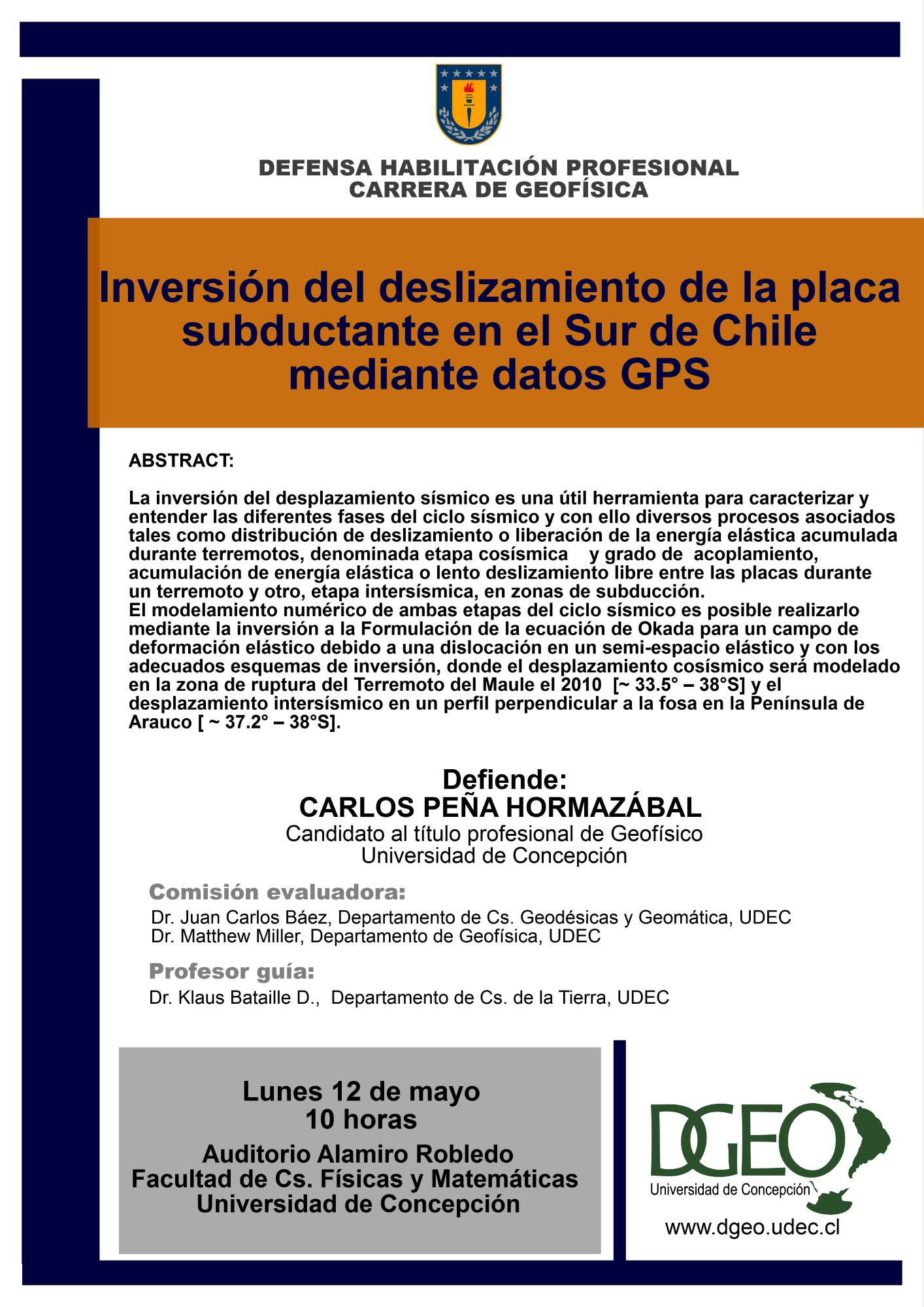 Se invita a todo el público interesado a asistir a la defensa de Habilitación Profesional de la carrera de Geofísica “Inversión del deslizamiento de la placa subductante en el Sur de Chile mediante datos GPS”, que será presentada por el candidato Carlos Peña Hormazábal, alumno de nuestra carrera. La comisión evaluadora estará constituida por los académicos: