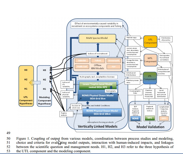 En dicho programa multidisciplinario, la modelación ecosistémica es utilizada para determinar qué condiciones ambientales tienen el efecto más significativo en la sobrevivencia de las especies en estudio: Snow crab, Blue King Crab, pollock. Un ensamble de modelos (ver figura) es utilizado para examinar los efectos oceanográficos, patrones de corrientes, disponibilidad de nutrientes y de alimento, interacciones con predación, y varias combinaciones de estos factores sobre la sobrevivencia de estas especies bajo esas condiciones. Esta información será de utilidad para apoyar el manejo de recursos y la predicción de la sobrevivencia de peces, y por lo tanto proyectar con mayor exactitud el número de peces que debería estar disponible para sustentar el ecosistema y las pesquerías comerciales en el futuro. Por otro lado, la información histórica disponible y los muestreos desarrollados en el marco del estudio son la base para el desarrollo de los modelos, así como también son utilizados para evaluar el poder predictivo de estos.