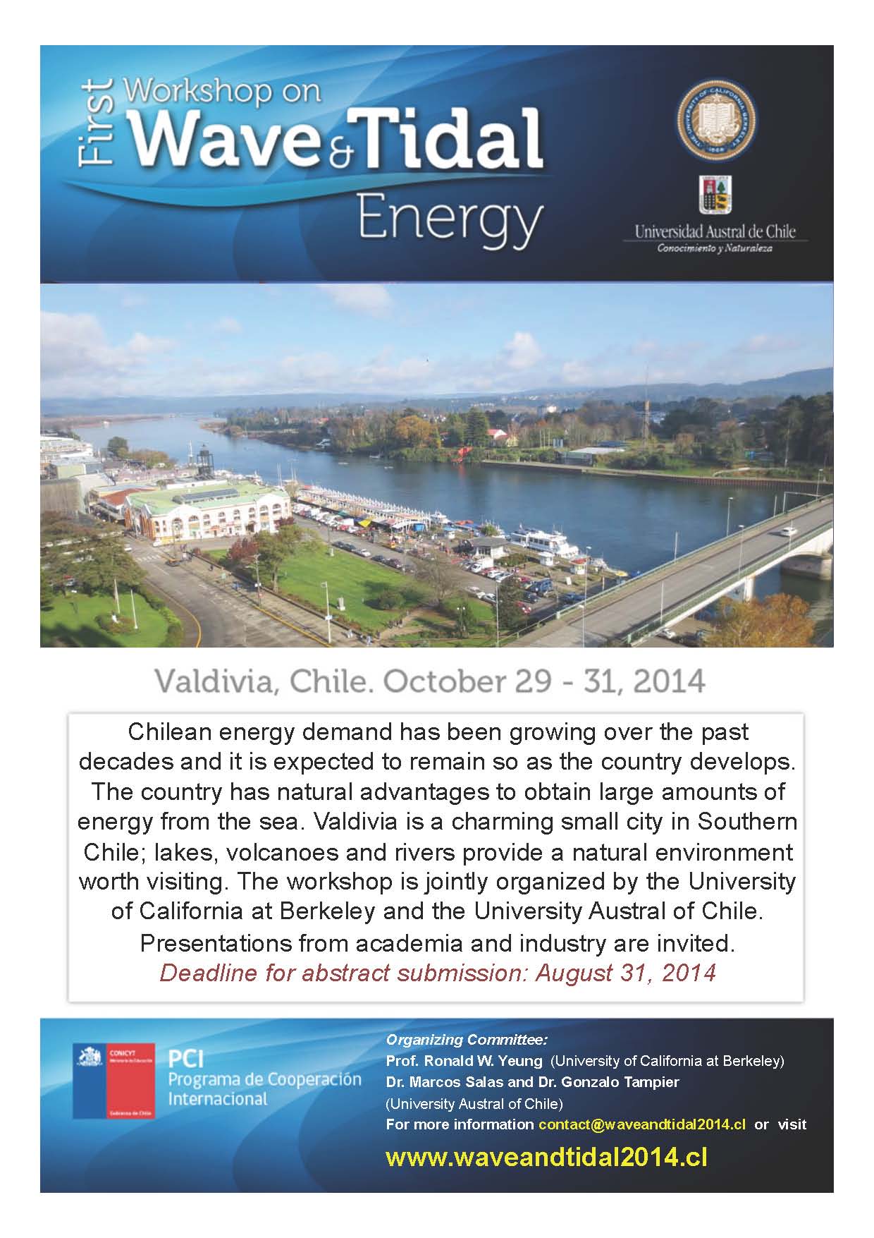 La demanda energética de Chile se ha ido incrementando durante las últimas décadas, tendencia que se espera que continúe a medida que el país se desarrolla. En este contexto es que la Universidad de California (Berkeley), en conjunto con la Universidad Austral de Chile, han organizado el Workshop “Wade & Tidal Energy”, el que se realizará del 29 al 31 de octubre, en Valdivia. Se invita a las presentaciones del mundo académico, y de la industria.