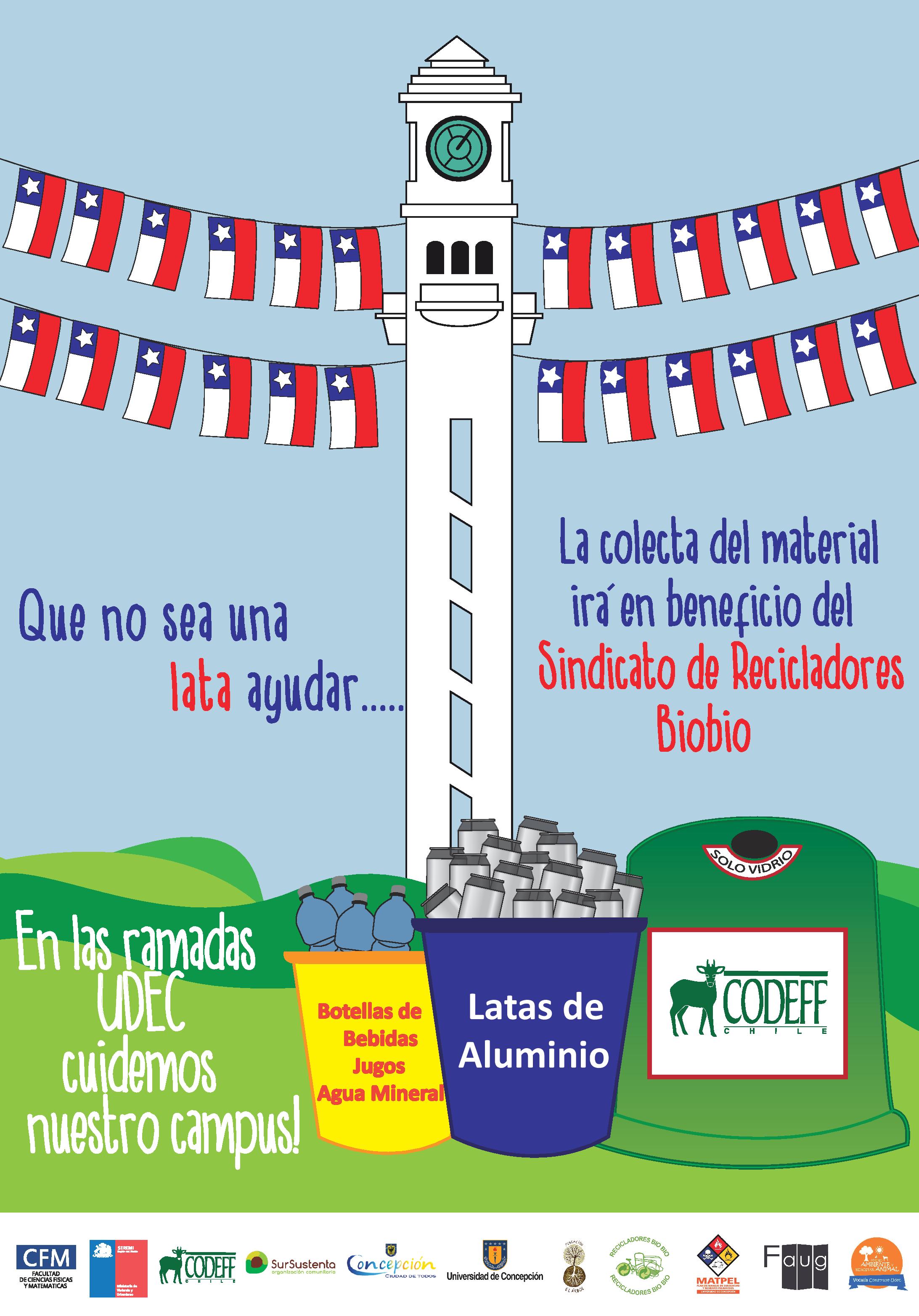 Ya es oficial que las ramadas universitarias se llevarán en cabo en nuestro campus el próximo viernes 5 de septiembre, y es en este contexto que el Departamento de Geofísica, en colaboración con la Facultad de Ciencias Físicas y Matemáticas, la Municipalidad de Concepción, la Seremi de Medio Ambiente, entre otras organizaciones, implementarán una campaña de reciclaje y cuidado del campus, cuyo fin es mermar las 22 toneladas de basura que anualmente se recogen luego del evento, y obtener de esto un porcentaje de material reciclado, el que irá en beneficio del Sindicato de Recicladores Biobío.