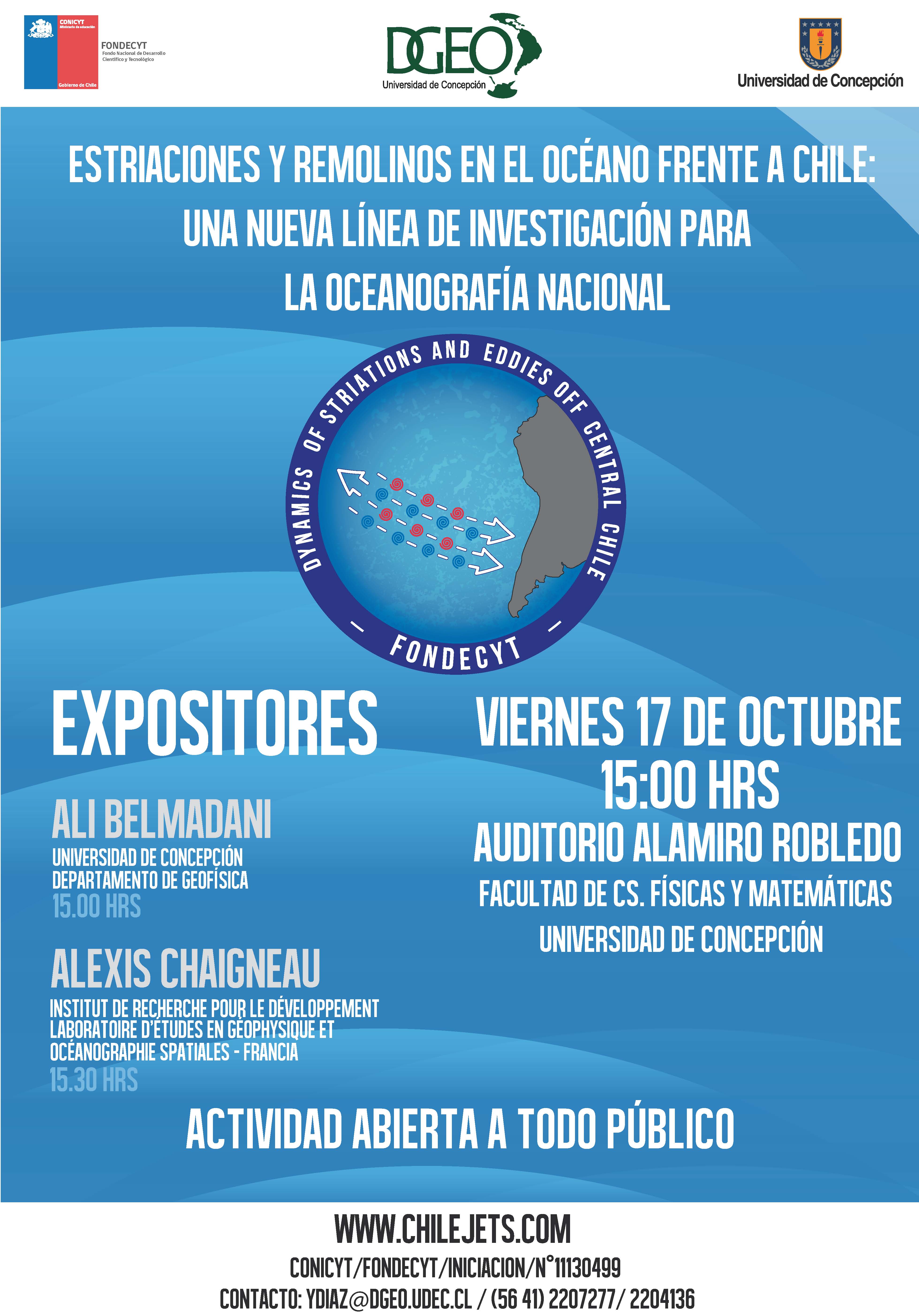 Estriaciones y remolinos en el océano frente a Chile: una nueva línea de investigación para la oceanografía nacional, es el nombre del seminario de lanzamiento que se realizará a las 15 hrs. de mañana viernes 17 de octubre, en el Auditorio Alamiro Robledo de la Facultad de Ciencias Físicas y Matemáticas, el cual será dictado por el Dr. Belmadani y por el Dr. Alexis Chaigneau, oceanógrafo físico del Laboratoire d’Etudes en Géophysique et Océanographie Spatiales (LEGOS, Francia), y también colaborador internacional del proyecto. La actividad es abierta a todo público interesado.