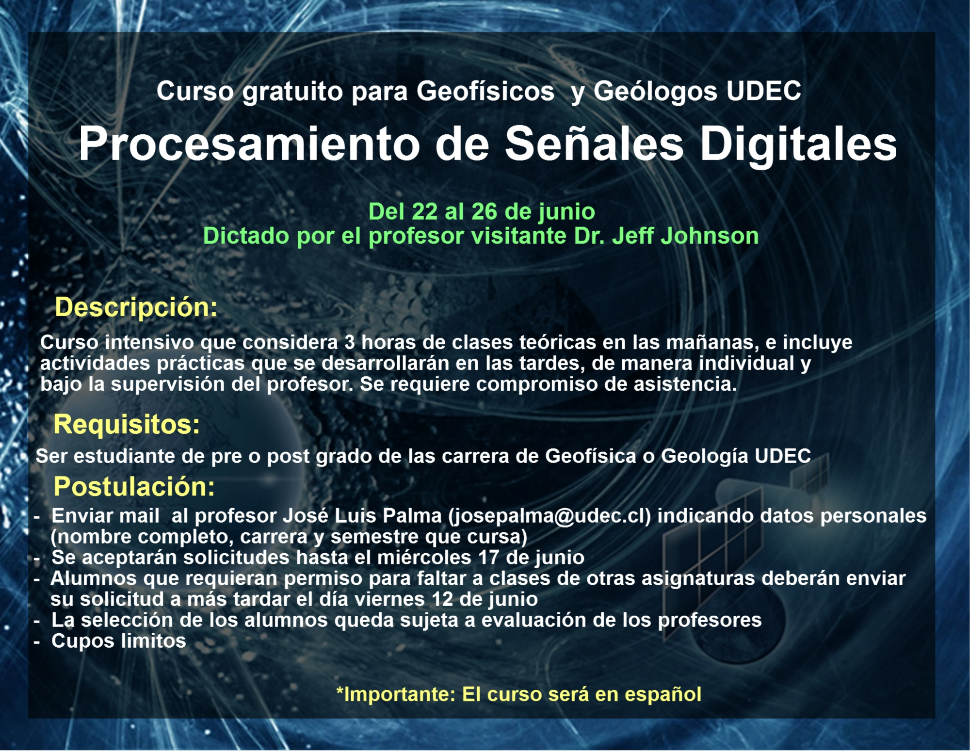 Durante la semana del 22 al 26 de junio se llevará a cabo el curso gratuito (y en español) Procesamiento de Señales Digitales, que será dictado por el profesor visitando Dr. Jeff Johnson, quien es Profesor asistente de la Universidad Estatal de Boise, y se especializa en el estudio geofísico multidisciplinario de los procesos eruptivos utilizando sismicidad, acústica, óptica y otras técnicas.