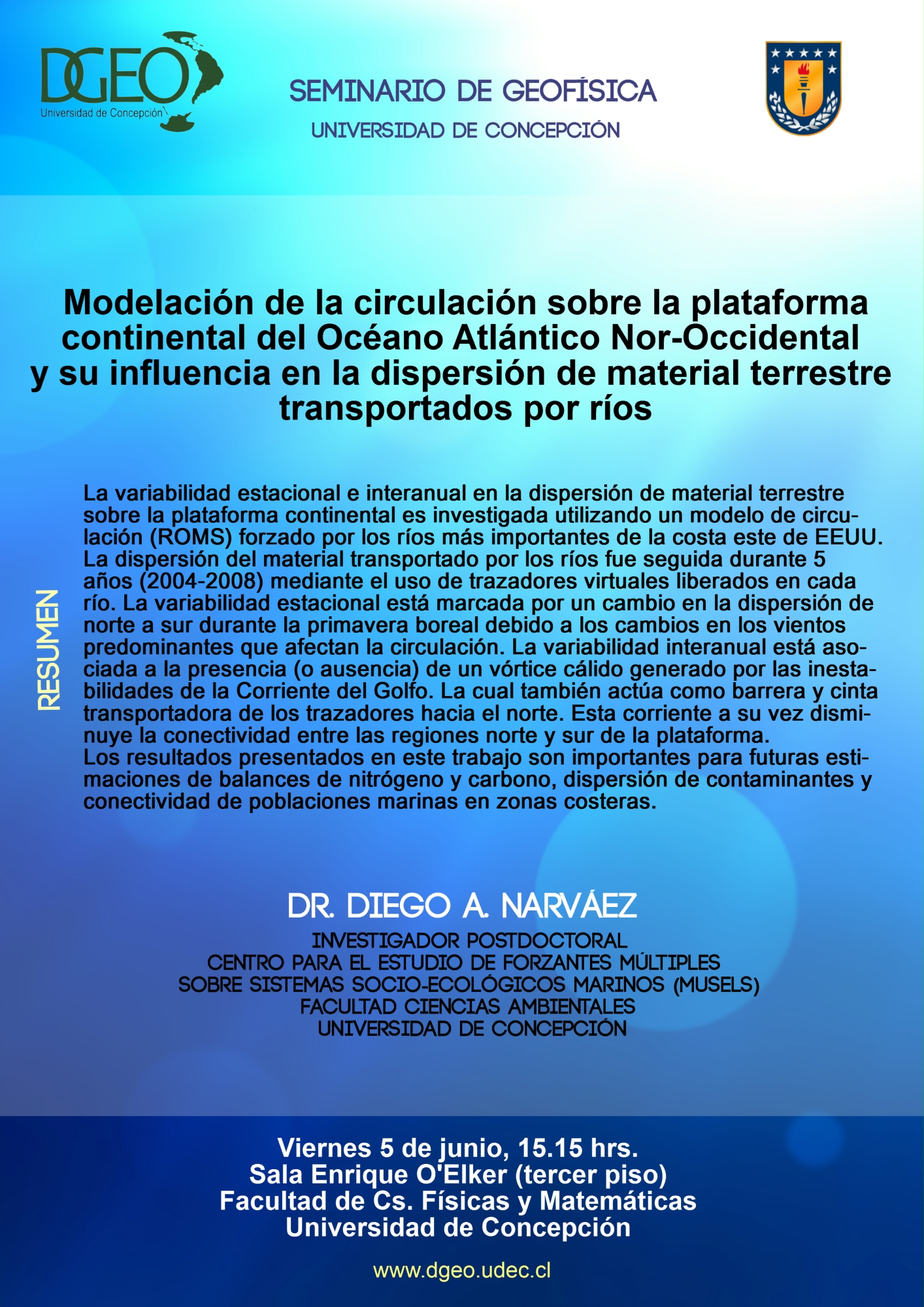 Reiteramos la invitación a participar del seminario “Modelación de la circulación sobre la plataforma continental del Océano Atlántico Nor-Occidental y su influencia en la dispersión de material terrestre transportados por ríos”, que será dictado el viernes 5 de junio por el Dr. Dr. Diego A. Narváez, quien es Investigador Postdoctoral del Centro para el Estudio de Forzantes Múltiples sobre Sistemas Socio-Ecológicos Marinos (MUSELS) de la Facultad Ciencias Ambientales de la Universidad de Concepción.