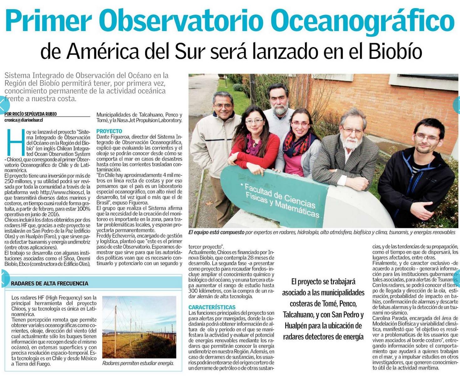 Según explica Dante Figueroa, profesor del Departamento de Geofísica de la Universidad de Concepción y Director del Observatorio, en el proyecto participa un completo equipo de científicos y técnicos del área de Oceanografía y Percepción Remota, quienes a partir de junio de este año, han comenzado a trabajar, para poner en marcha el sistema de observación costero, que en una primera etapa, se desarrollará sólo para la región del Biobío. Cabe destacar que este sistema de observación existe en varios otros países, como Estados Unidos, Francia, y Australia, sin embargo, hasta la ejecución de CHIOOS, no existía tal tecnología en toda Sudamérica.