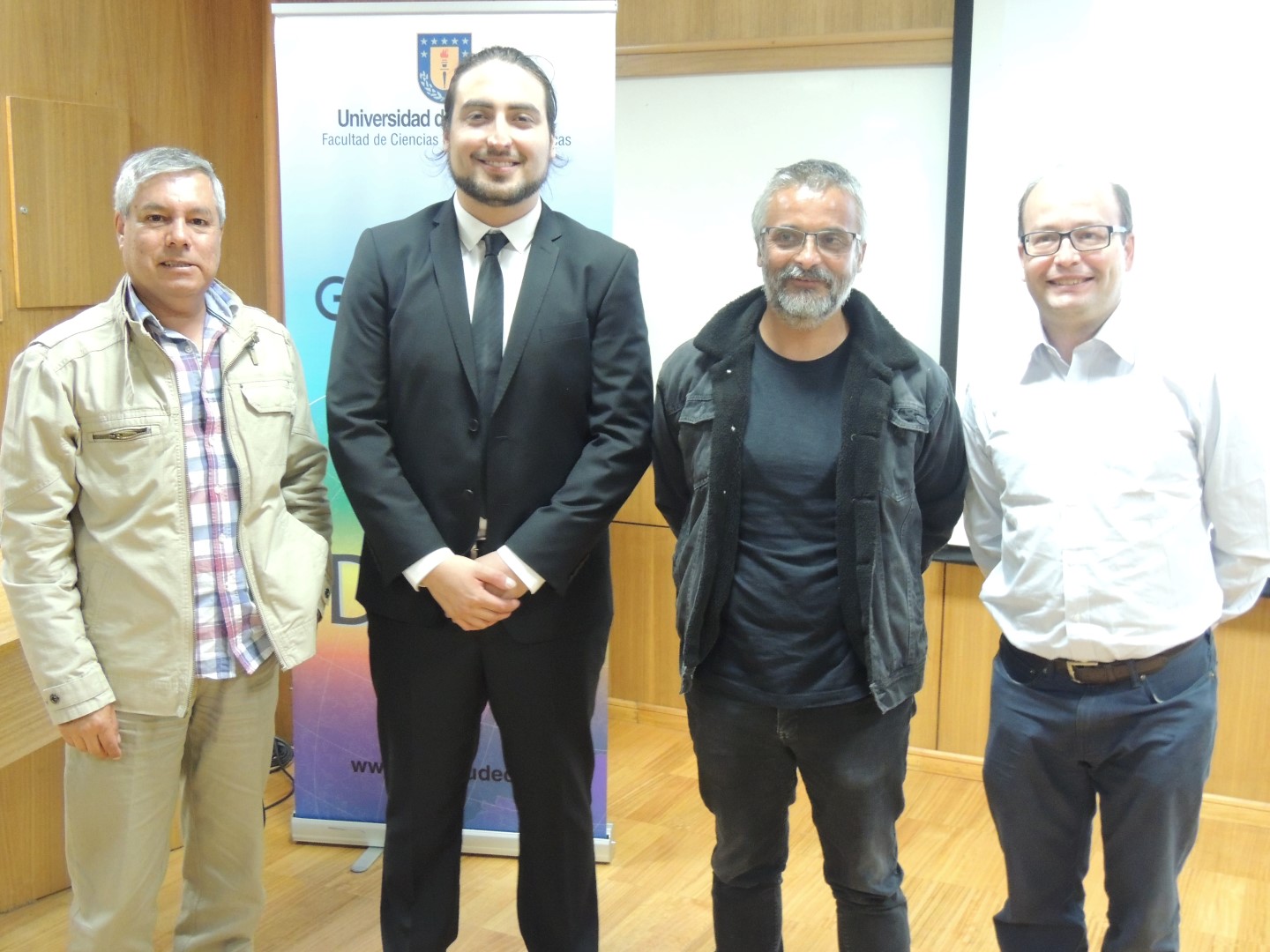 Posteriormente, a las 19 hrs. y en el mismo lugar, fue el turno de Matías Guzmán, quien presentó su trabajo “Análisis de eventos de precipitación en Antofagasta (23,6°S, 70.4°W), Chile”, el que fue evaluado por su Profesor guía, Dr. Aldo Montecinos (DGEO, Universidad de Concepción), Dr. Ricardo Muñoz (DGF, Universidad de Chile), y Dr. Juan Carlos Inzunza (DGEO, Universidad de Concepción). Al finalizar el alumno recibió el veredicto de su comisión, que lo aprobó de manera unánime como Geofísico.