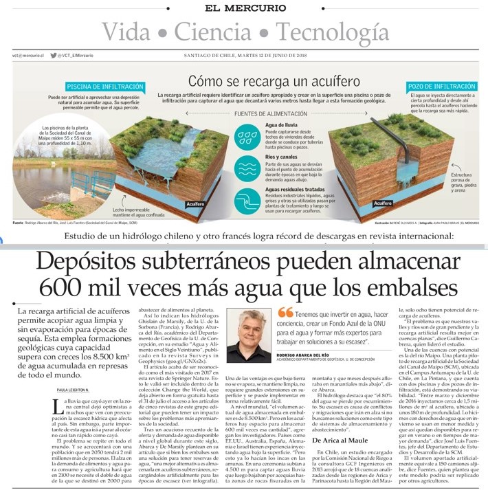 La recarga artificial de acuíferos permite acopiar agua limpia y sin evaporación para épocas de sequía. Esta emplea formaciones geológicas cuya capacidad supera con creces los 8.500 km {+3} de agua acumulada en represas de todo el mundo.