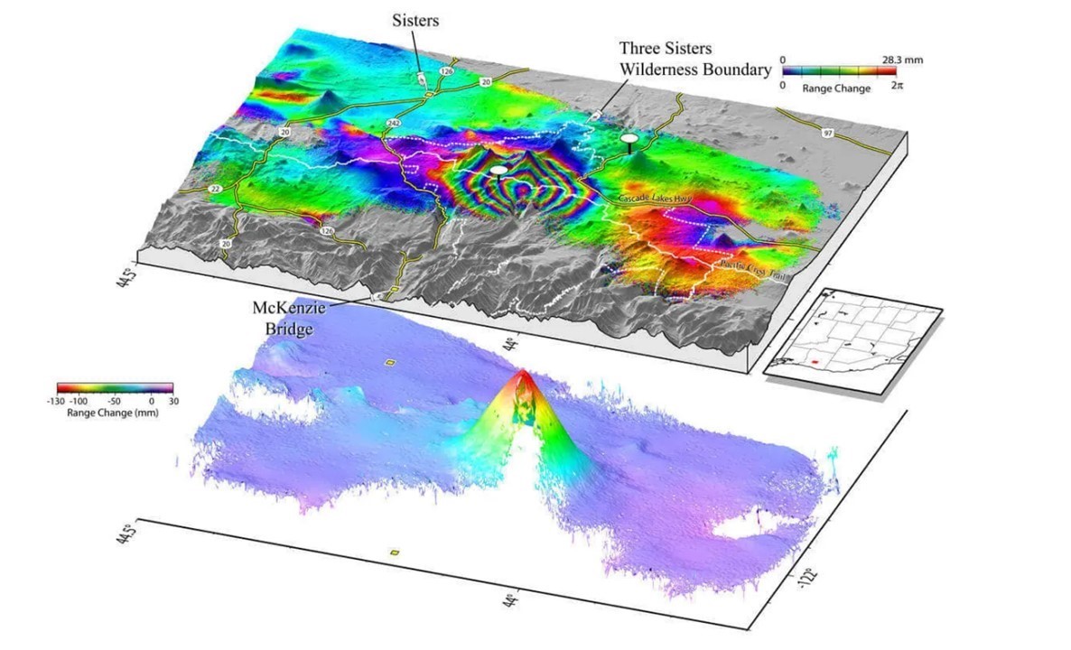 Ejemplo de un estudio con Interferometría de Radar de Apertura Sintética, en este caso sobre el Volcán South Sister, de Estados Unidos, donde se muestra un patrón de levantamiento del suelo entre 1995-2001.