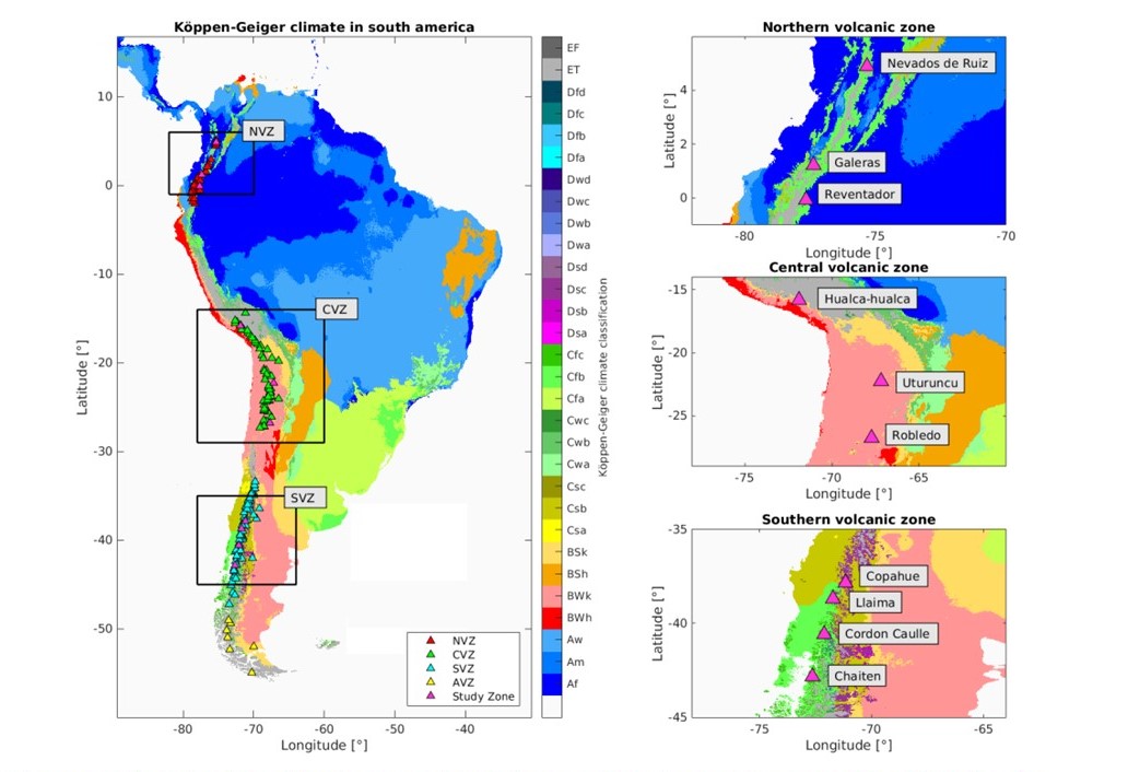Ubicación de los 10 volcanes de la Cordillera de Los Andes considerados en la nueva base de datos confeccionada en el estudio. Están en las tres zonas volcánicas de América del Sur, dos de las cuales incluyen a Chile. Las áreas de colores identifican zonas climáticas.