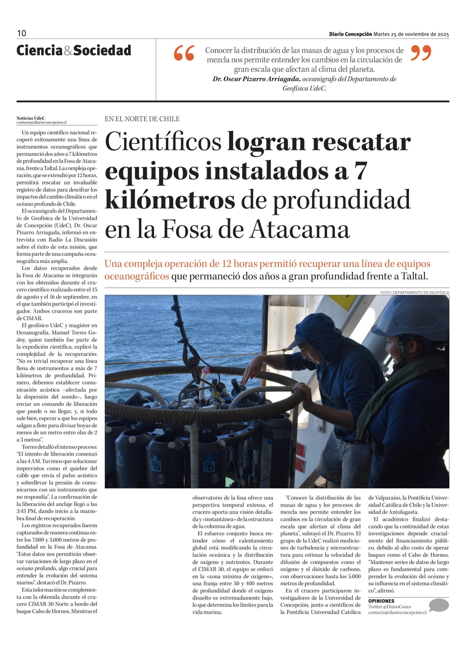 | Científicos logran rescatar equipos instalados a 7 kilómetros de profundidad en la Fosa de Atacama | Diario Concepción | 25 de noviembre | Oscar Pizarro Arrigada y Manuel Torres Godoy |