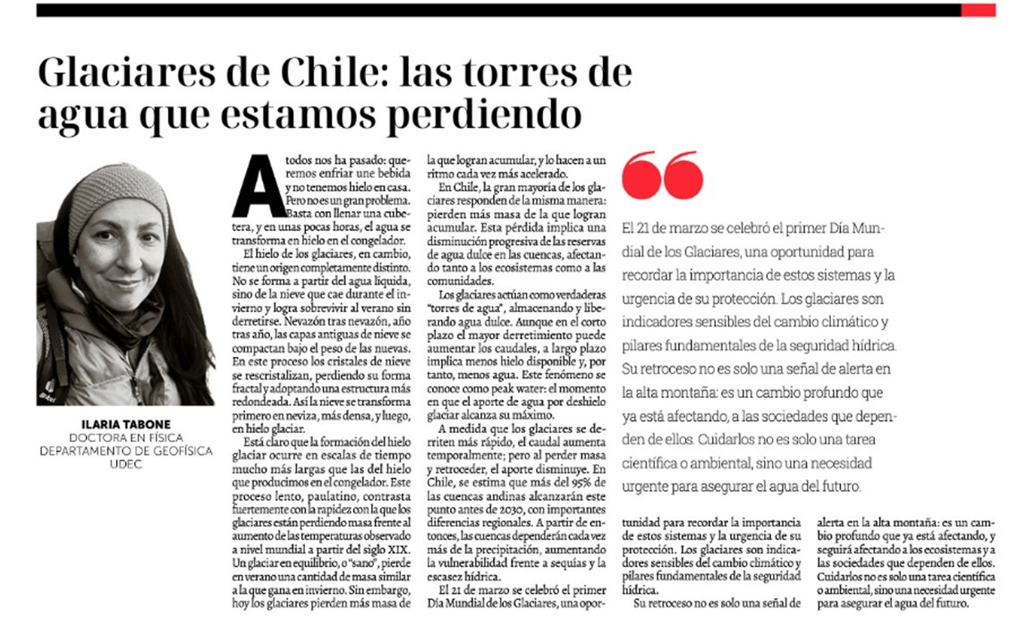 | Jornada de Diálogos Contemporáneos UdeC abordará la relevancia de los glaciares: transmitirá TVU | Tvu.cl | 28 de mayo | Ilaria Tabone |